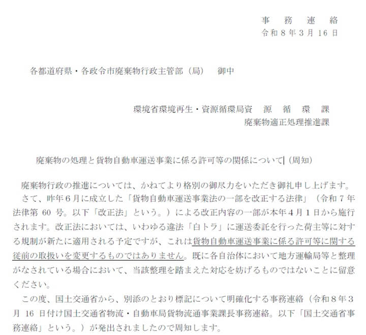 廃棄物行政の推進については、かねてより格別の御尽力をいただき御礼申し上げます。さて、昨年6月に成立した「貨物自動車運送事業法の一部を改正する法律」(令和7 年法律第60 号。以下「改正法」という。)による改正内容の一部が本年4月1日から施行されます。改正法においては、いわゆる違法「白トラ」に運送委託を行った荷主等に対する規制が新たに適用される予定ですが、これは貨物自動車運送事業に係る許可等に関する従前の取扱いを変更するものではありません。既に各自治体において地方運輸局等と整理がなされている場合において、当該整理を踏まえた対応を妨げるものではないことに留意ください。